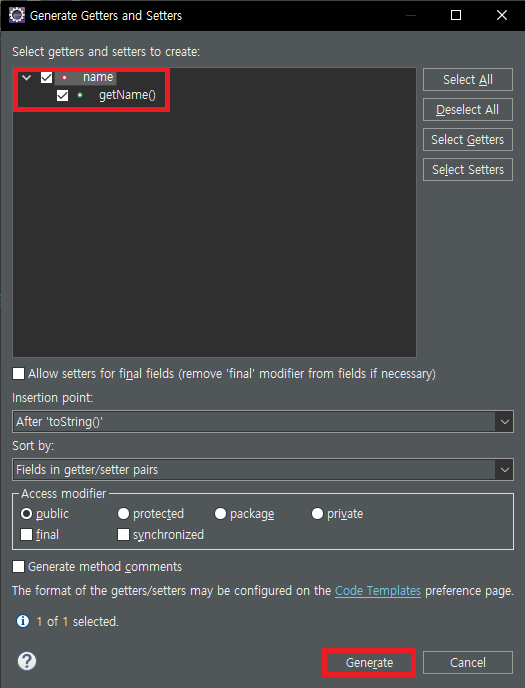 해당 클래스에서 마우스 우클릭(alt+shift+s) ▶ source ▶ getter,setter 선택